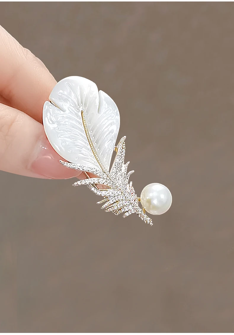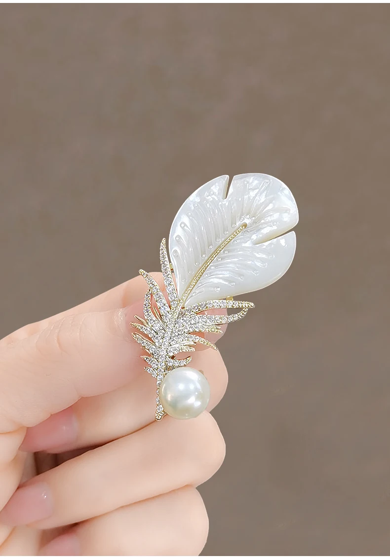 Fashion Crystal Shell Feather Brooch Pins For Women Luxury White Pearl Gold Color Party Wedding Gifts Clothing Accessories