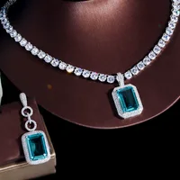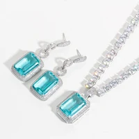 Fashion Light Blue Cubic Zirconia Long Big Rectangle Dangle Earrings and Necklace Set for Women Party Jewelry