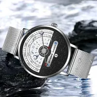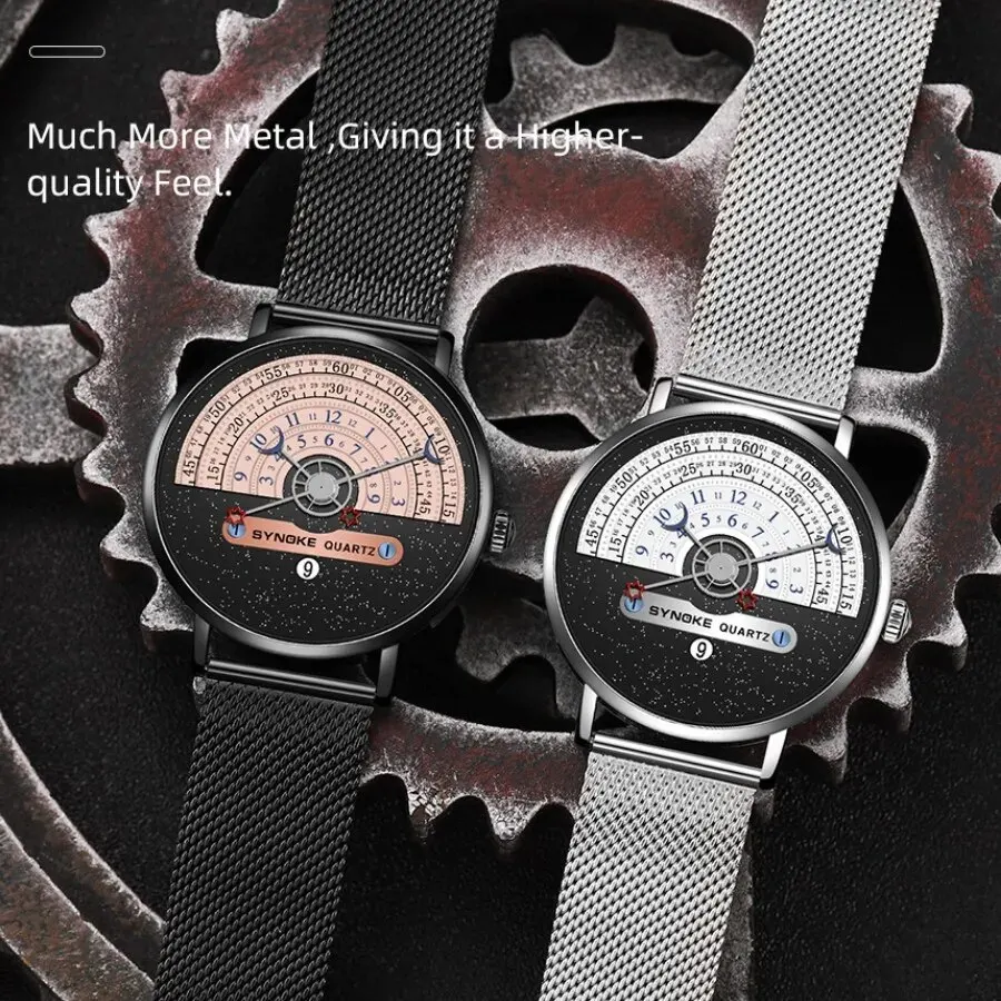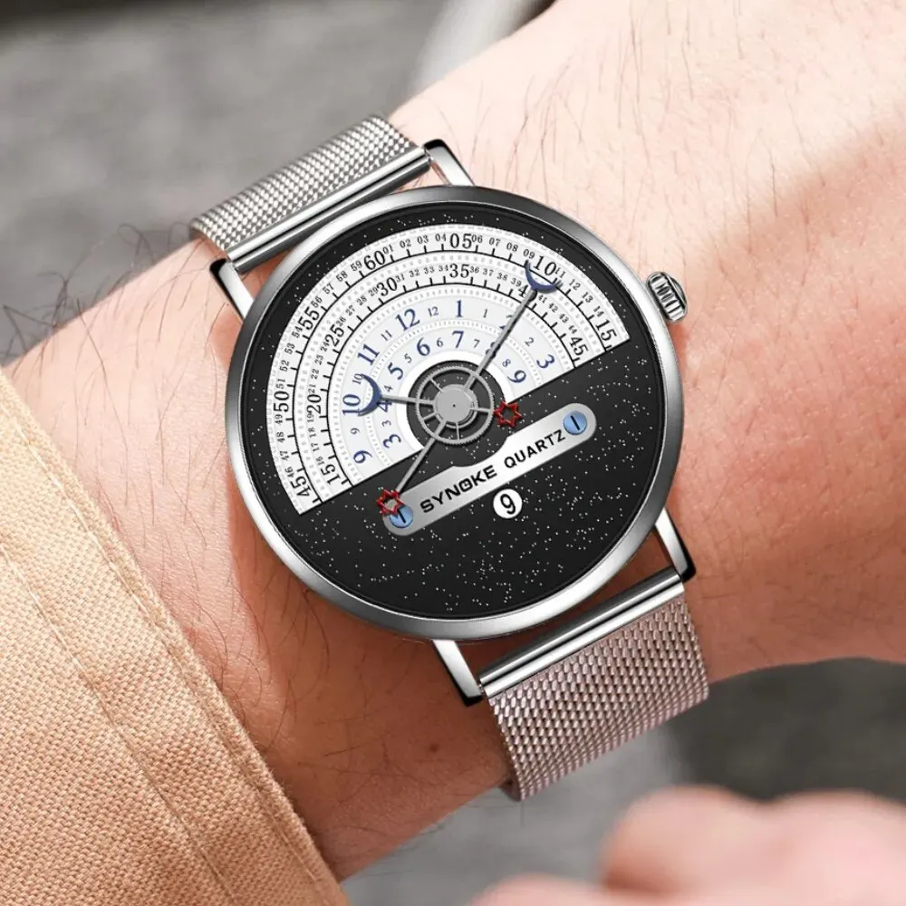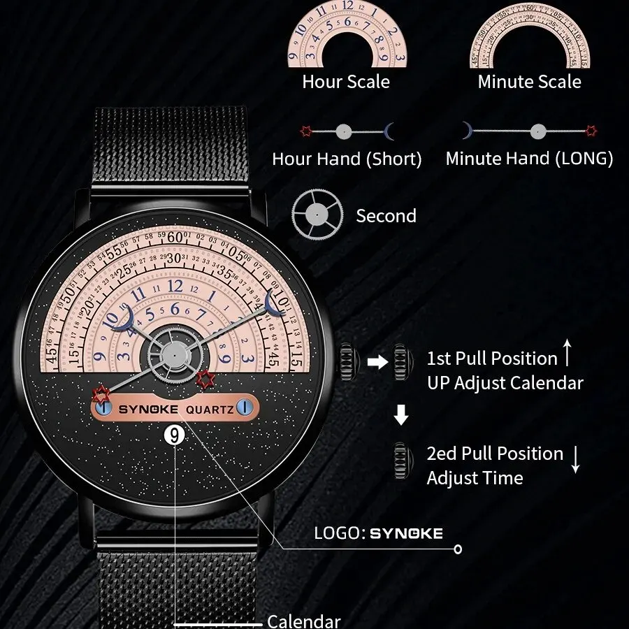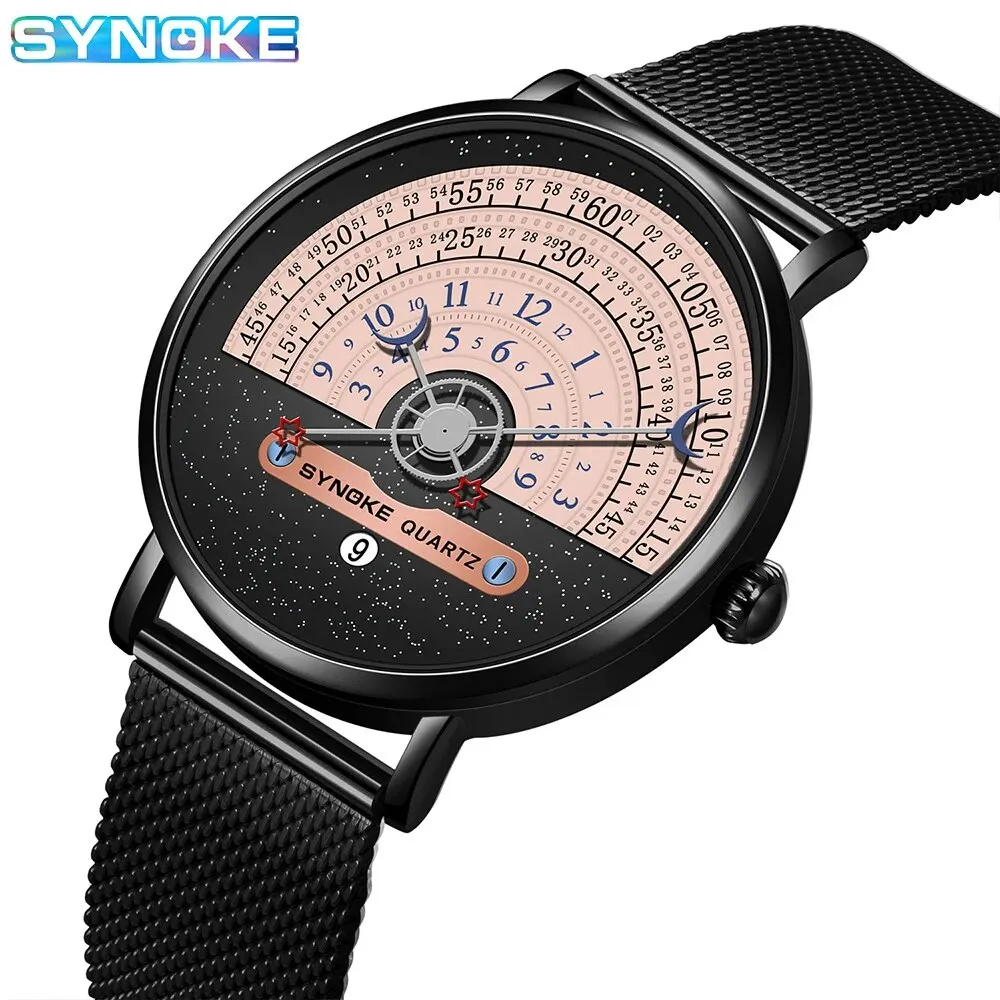 SYNOKE Fashion Men Quartz Wristwatch Business New Star Moon Concept Black and White Watch Calendar Half Wheel Time Display Creative