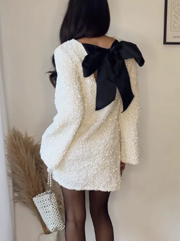Fashion Shining Sequin Mini Dress For Women Long Sleeve Bowknot Chic Short Dresses Female Elegant Holiday Evening Party Looks