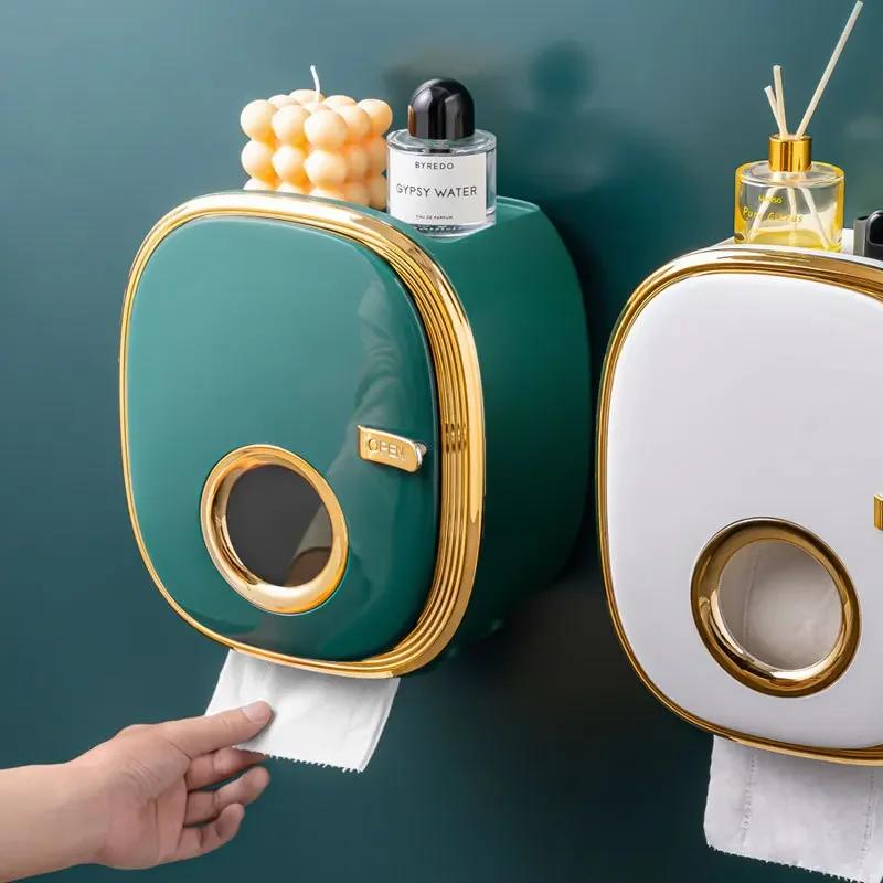 Golden Bathroom Shelf Storage Box Punch-Free Wall-Mounted Toilet Paper Holder Box Waterproof Paper Towel Bathroom Storage Rack
