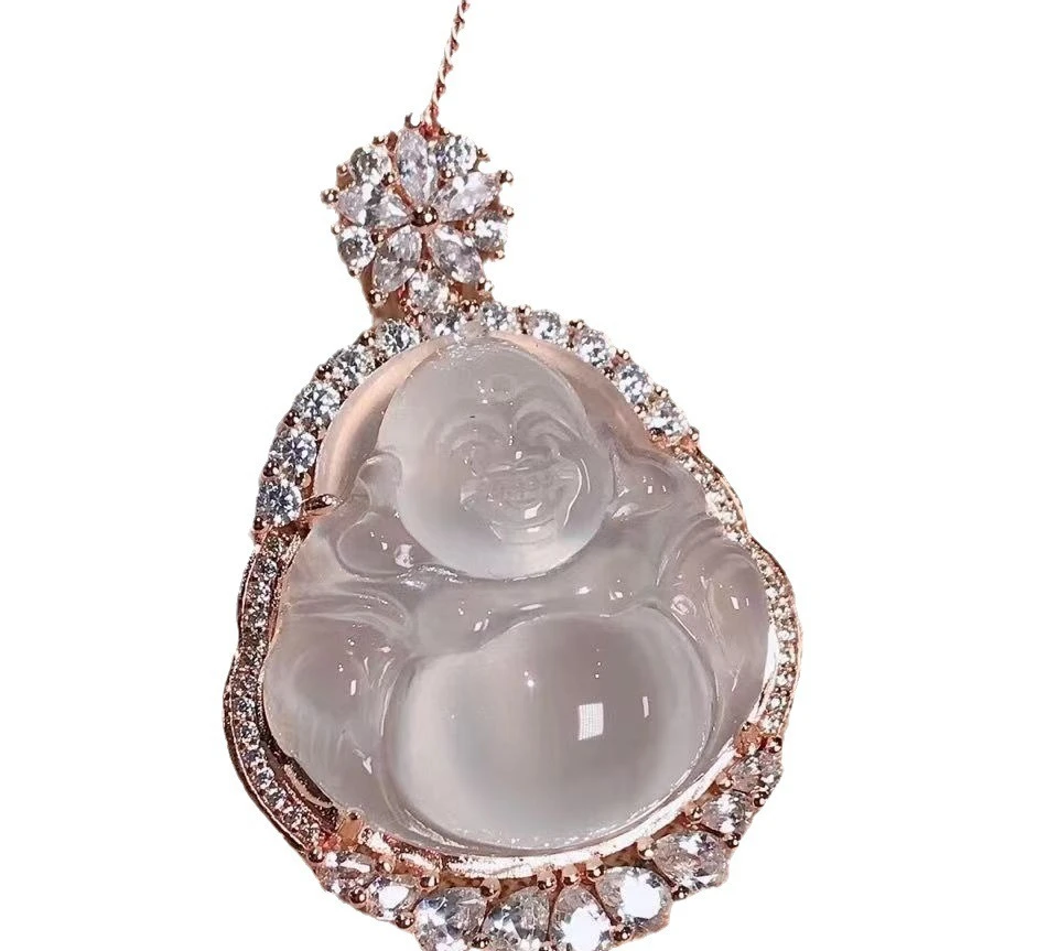 High ice white chalcedony Buddha Gong pendant women’s glass natural chalcedony necklace silver-plated inlaid jade jewelry