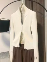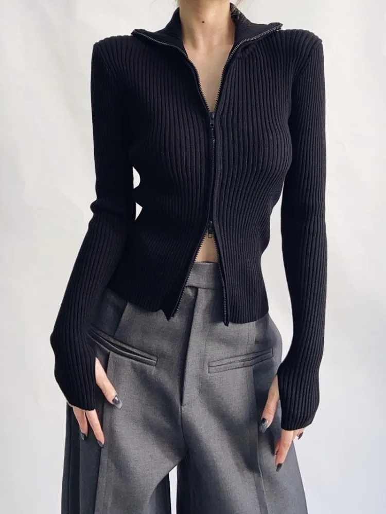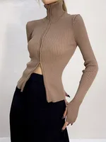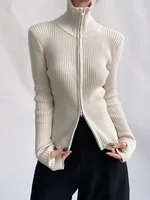 Knitwear Women Cardigan Coat Temperament Vintage Sueter Turtleneck Double Zippers Pull Femme Autumn Casual Ribbed Sweater Tops