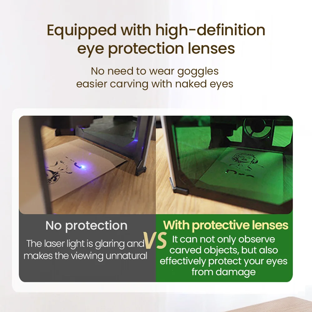 With preset eyes-protective lens, can block 97% of laser strong brightness light directly with no goggle needed, preventing eyes burn, this design also is kindly for glasses-wearing people, get more convenient carving experience
