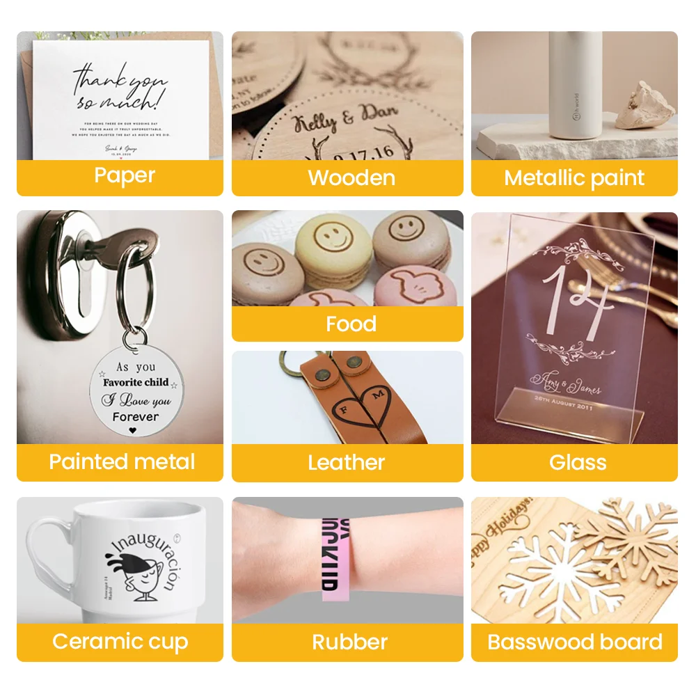 Applicable Materials: wood, paper, plastic, leather, bamboo, kraft paper, painted metal,etc. Can cut 0.2mm paper, wood, leather.