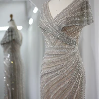 Luxury Dubai Silver Nude Mermaid Evening Dresses for Women Wedding Elegant Cap Sleeves Arab Formal Party Gowns