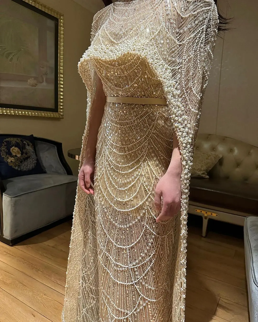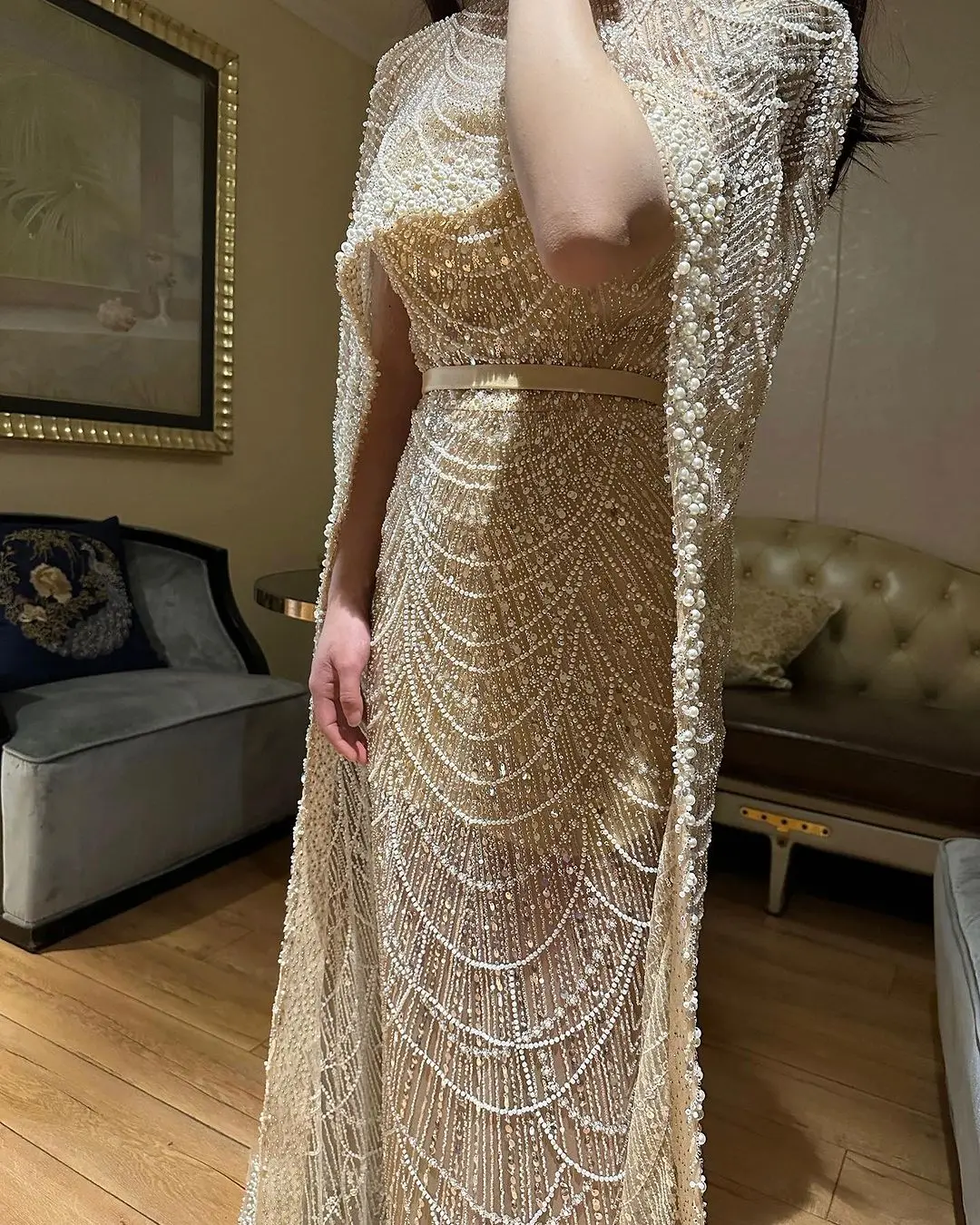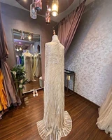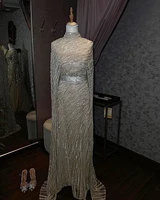Luxury Pearls Dubai Beds Champagne Evening Dresses with Cap Arabic Women Mermaid Wedding Party Celebrity Prom Dress