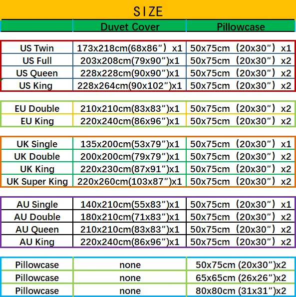 Note: pillowcase size:50*70×2 / 65*65×2 / 80*80×2 ( Note: The duvet cover is not included inside, only 2 pillowcases. Please purchase with caution)