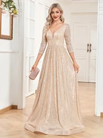 Luxury V Neck Long Sleeves Blue Sequins Formal Evening Dress Women, Wedding Party Prom Maxi Cocktail Dress Gowns