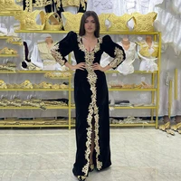 Moroccan Caftan Evening Dress Gold Appliques Lace Long Sleeve black Mermaid Velvet Arabic Prom Gowns Party Dress