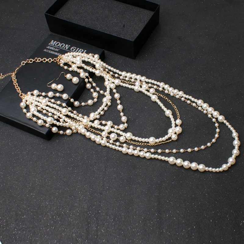 Multi-layer Simulated Pearls Chain Long Necklace Trendy Statement Choker Necklace for women Fashion Jewelry