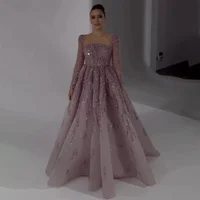 Muslim Pink A Line Beaded Luxury Dubai Long Evening Dresses Gowns for Woman Wedding Party