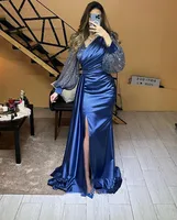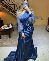 Navy Evening Dresses Wedding Party Sexy Women V-Neck Long Sleeve Mermaid Satin Arab Fashion Celebrity Prom Gowns