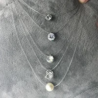 New Personality Fashion Square Imitation Pearl Crystal Zircon Necklace Invisible Transparent Fishing Line Necklace Women