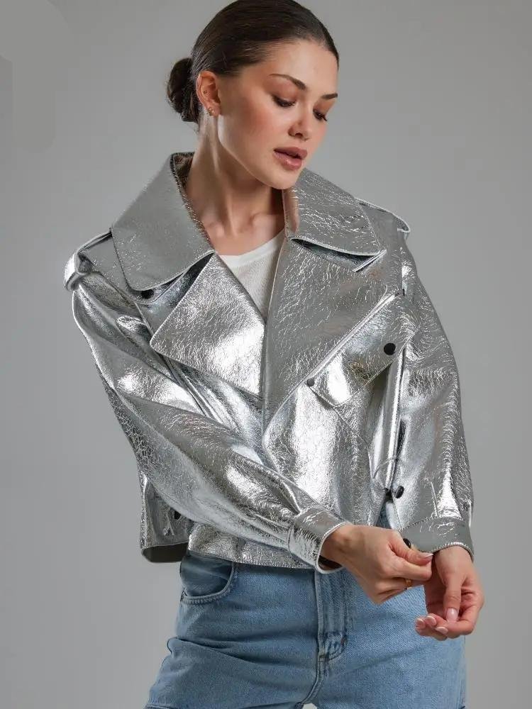 Oversized Silver Women’s Fake Leather Jacket Elegant Loose Lapel Long Sleeved Coat Autumn Lady Streetwear PU Motorcycle Jackets