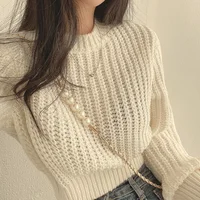 Pink Cropped Knitted Sweaters for Women Korean Fashion Loose Long Sleeve Jersey Woman Solid Color Wild Round Neck Pullover