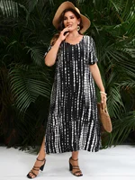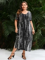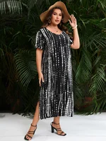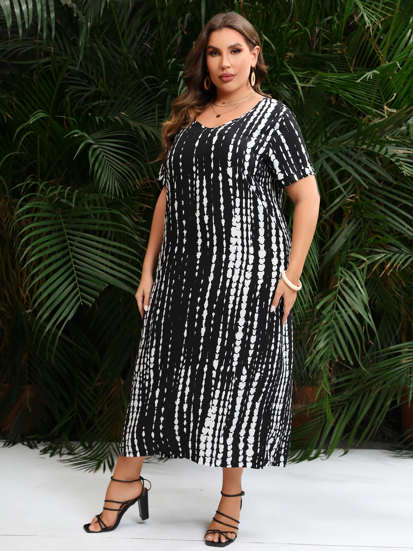 Plus Size Dress for Woman Summer V Neck Short Sleeve White Black Striped Print Casual Dress Loose Oversized Maxi Long Dress