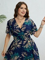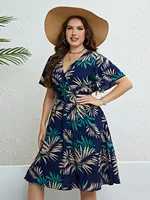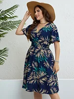 Plus Size Floral Print Wrapped V-Neck Women Dresses Short Ruffle Sleeves A-Line Bohemia Robe Casual Lady Vacation Clothing
