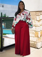 Plus Size Two Piece Set Women, Print Shirts Tops and Pants Pockets Wide Leg Fall Fashion Matching Suit