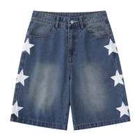 Retro Star Splicing Denim Shorts, Men Summer Harajuku Streetwear Jeans Shorts Fashion Casual Loose Blue Denim Shorts Unisex