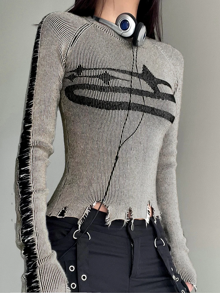 Ripped Vintage Sweater Harajuku Patchwork Print Long Sleeve Jumpers for Women Autumn Winter Basic Pullovers Street Style