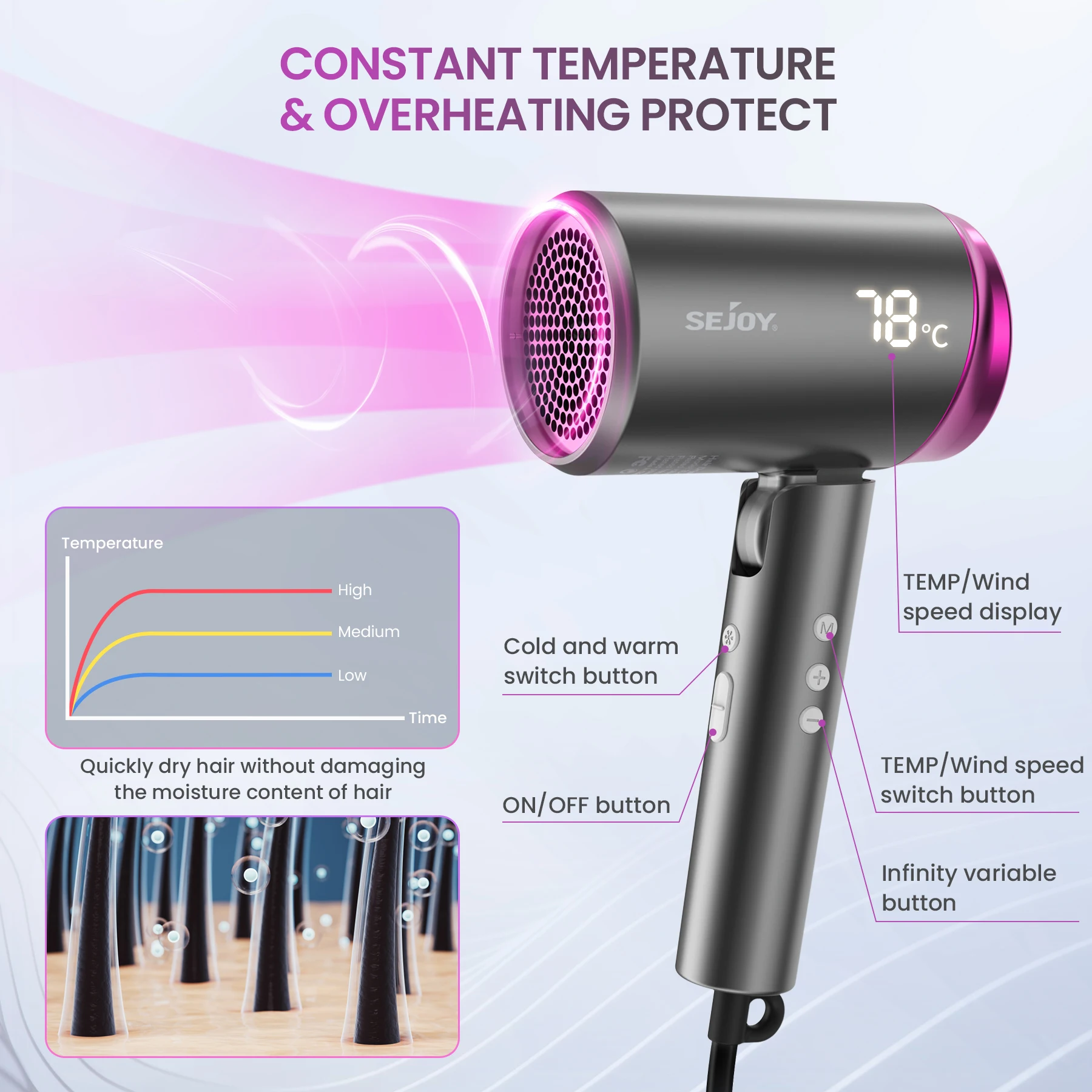 High-Speed Electric Turbine Airflow :Experience the power of high-speed electric turbine airflow, designed to dry your hair quickly and efficiently.