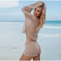 Sexy Beach Crop Top Shorts Sets Women Knit Long Sleeve Lace Up Female Suit Summer Holiday See Through 2 Piece Set Womens