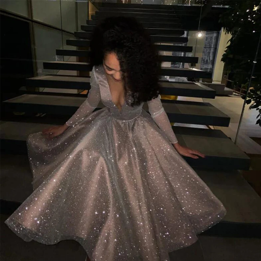 Sparkling Sequins Evening Dress Robe Longue V- Neck Long Sleeves Medium Length Wedding Party Dress Prom Gowns Custom Made