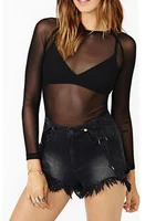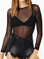 Spring Summer Womens Long Sleeve Sexy Black Mesh Top Blouses Transparent Punk Club Shirt Tees Beach Tops