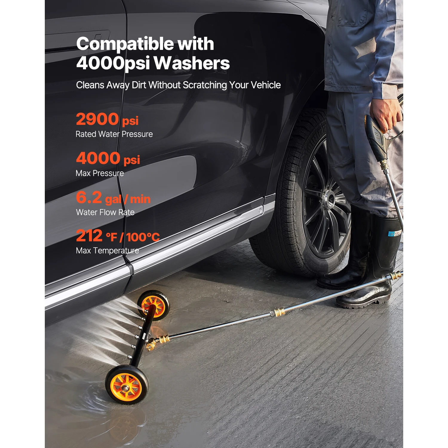 - 4000 PSI High Water Pressure: With a rated water pressure of 2900 PSI and a maximum pressure of 4000 PSI, this power washer surface cleaner can handle hot water up to 100°C, making it ideal for winter cleaning. It quickly removes dirt and debris without damaging your vehicle’s undercarriage.