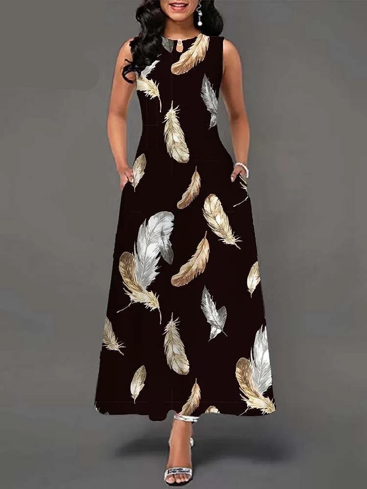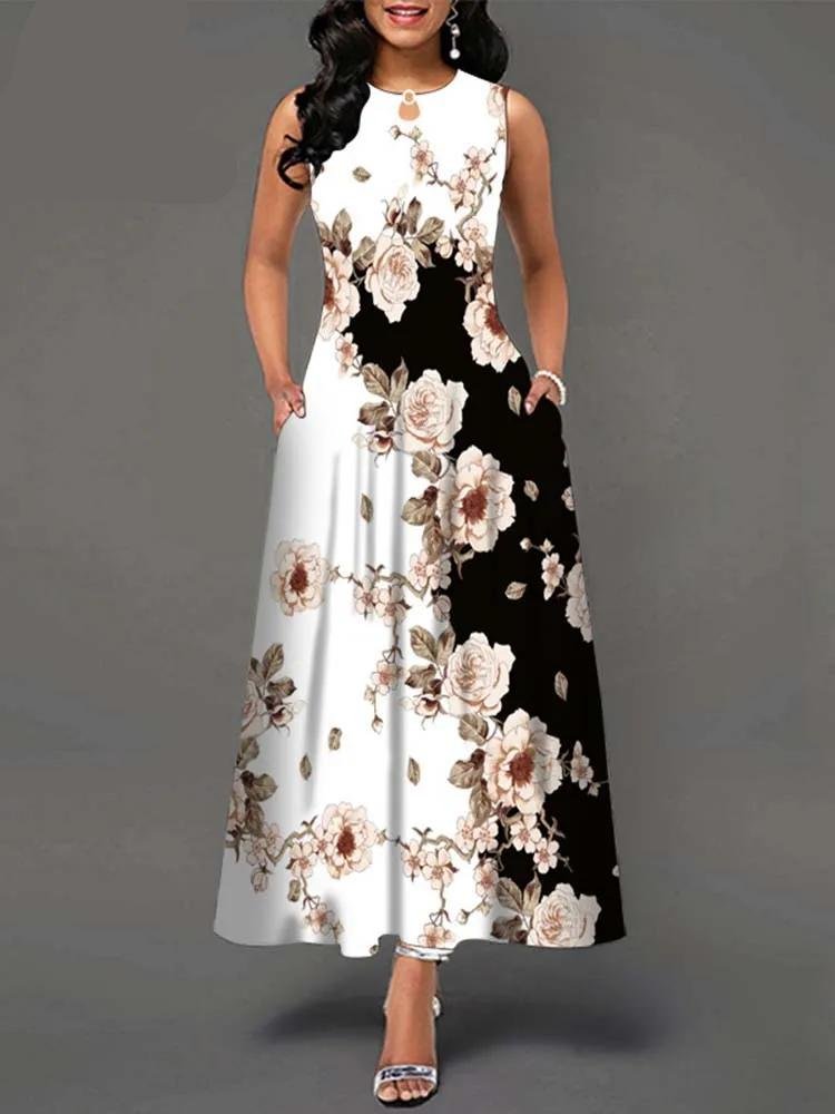 Summer Boho Long Dresses Women Elegant Sleeveless Casual Floral Print Beach Party Maxi Dress