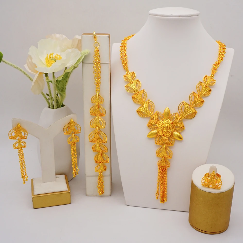 Trendy Gold Color Jewelry Set For Women Tassel Long Chain Bridal Long Necklace Bracelet Earring Ring Wedding Sets