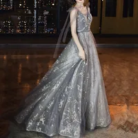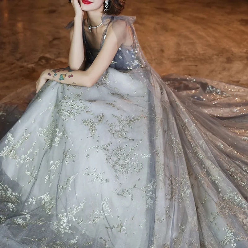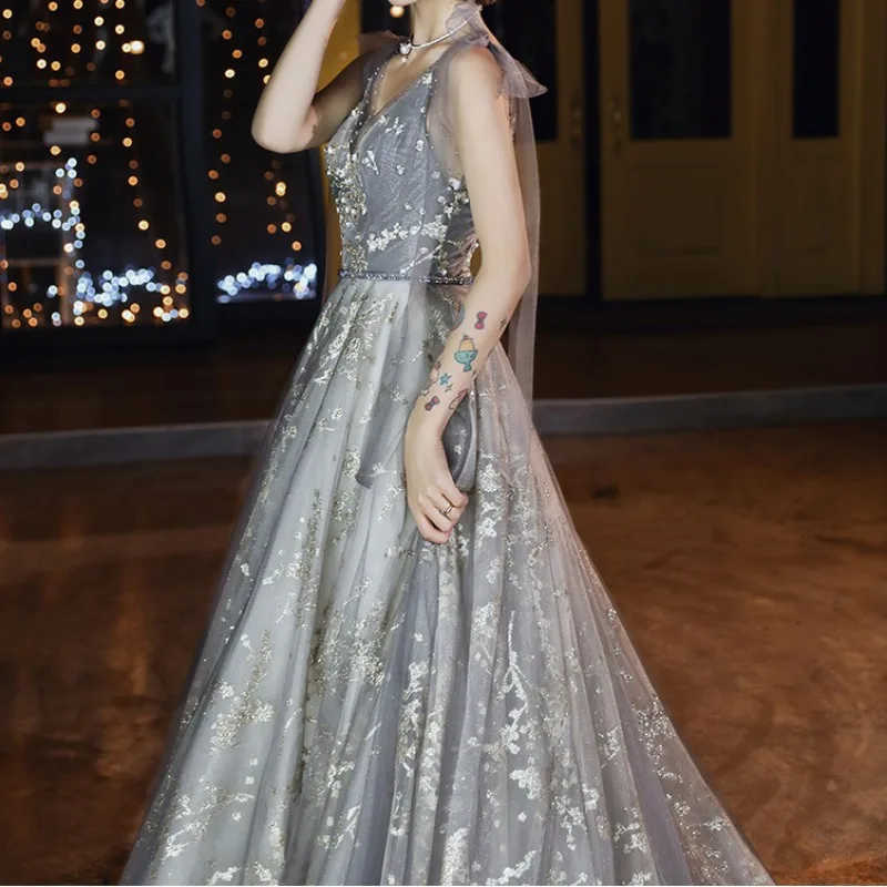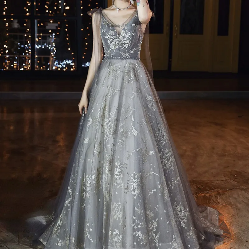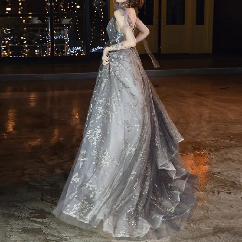 V-neck Lace-up Elegant Sequined Wedding Party Dresses Fairy Slim Waist Mesh Tiered Prom Dress Elegant Temperament Evening Robe