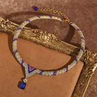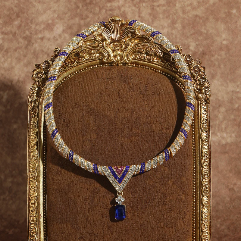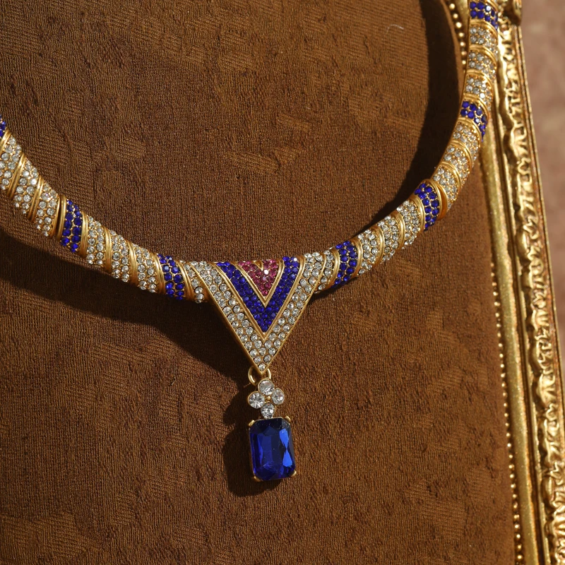 Vintage Blue Zircon Pendant Necklace Gold Color Choker Collar Woman Rhinestone Wedding Accessories Luxury Designer Jewelry