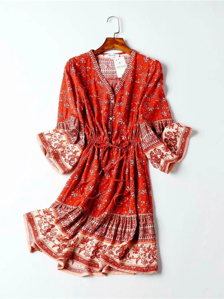 Vintage chic fashion women hippie floral print V-neck Bohemian mini dresses Summer ladies flare sleeve cotton beach Boho dress