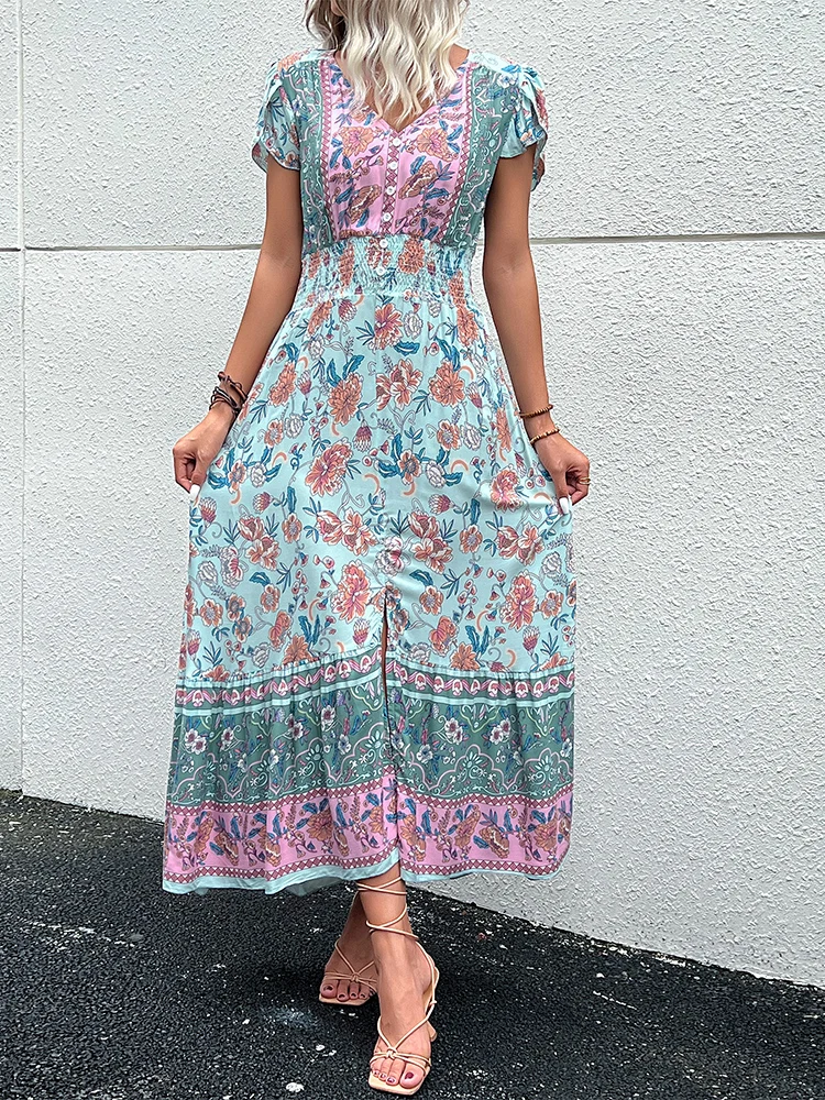 Vintage Floral Boho Printed Vestidos Women Short Sleeves V Neck Slit Midi Dresses A Line Bohemian Summer Beach Dress
