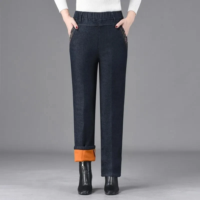 Winter Plush Velvet Lined Jeans Straight Denim Pants Mom High Waist embroidered Baggy Vaqueros Vintage Thicken Warm Kot Pantolon