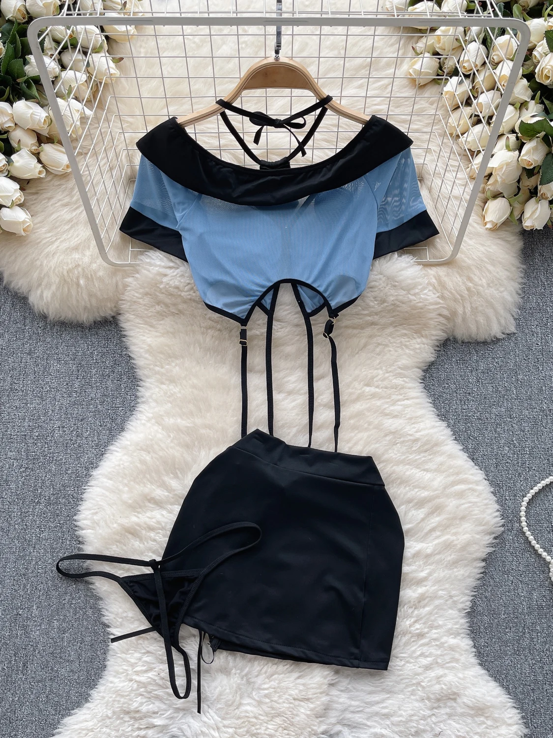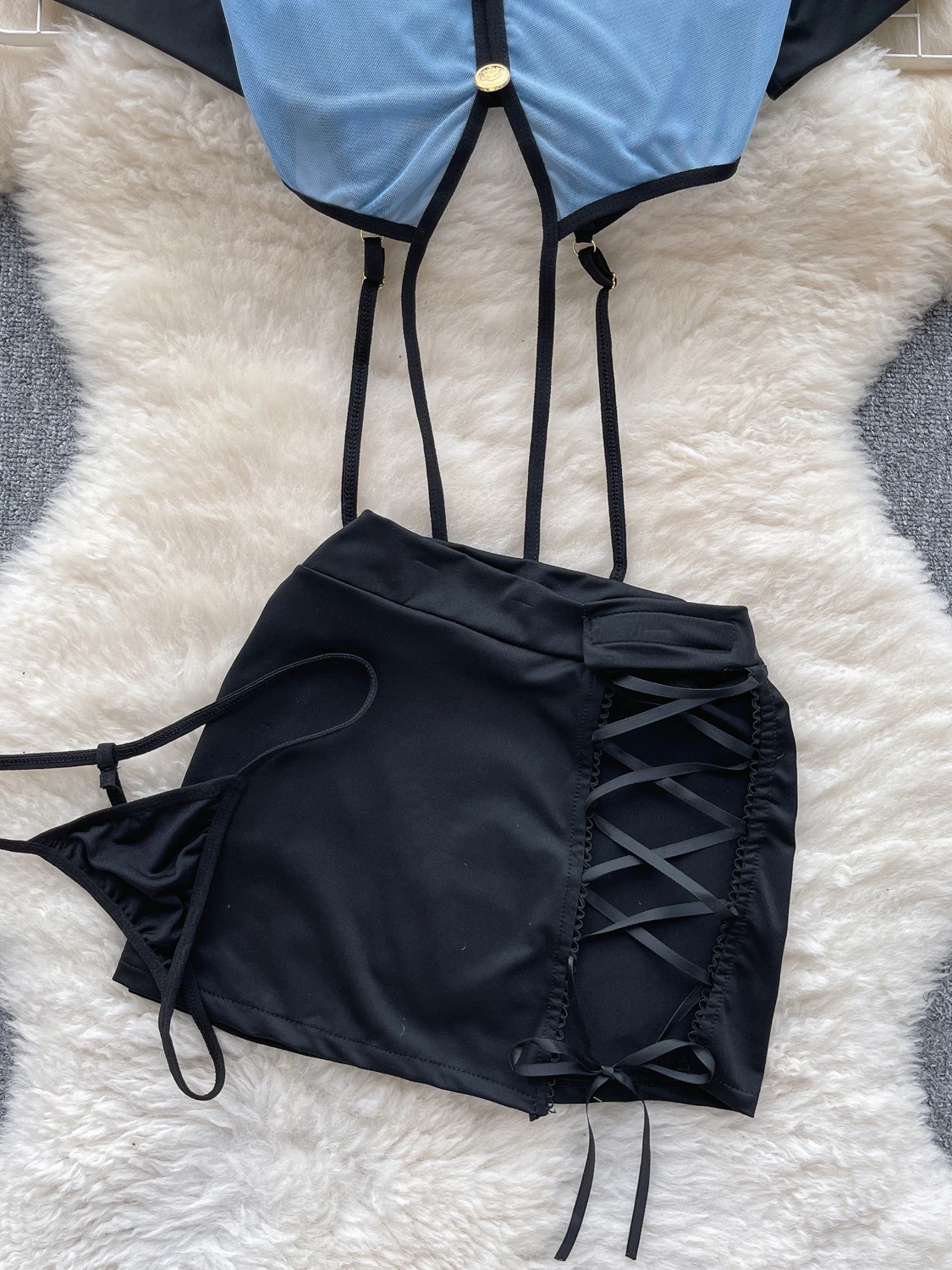 Women Preppy Style Sexy Uniform Sets, V Neck Sheer Top+Lace Up Mini Skirt+Thongs Hollow Out Cosplay Porn Suits