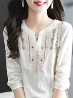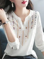 Women Spring Autumn White Blouses Tops Lady Casual Embroidery V-Neck Long Sleeve Vintage Loose Blusas Top