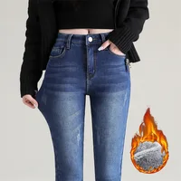 Women Thermal Jeans Winter Snow Warm Plush Stretch Jeans Lady Skinny Thicken Fleece Denim Long Pants Retro Blue Pencil Trousers