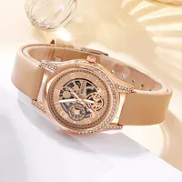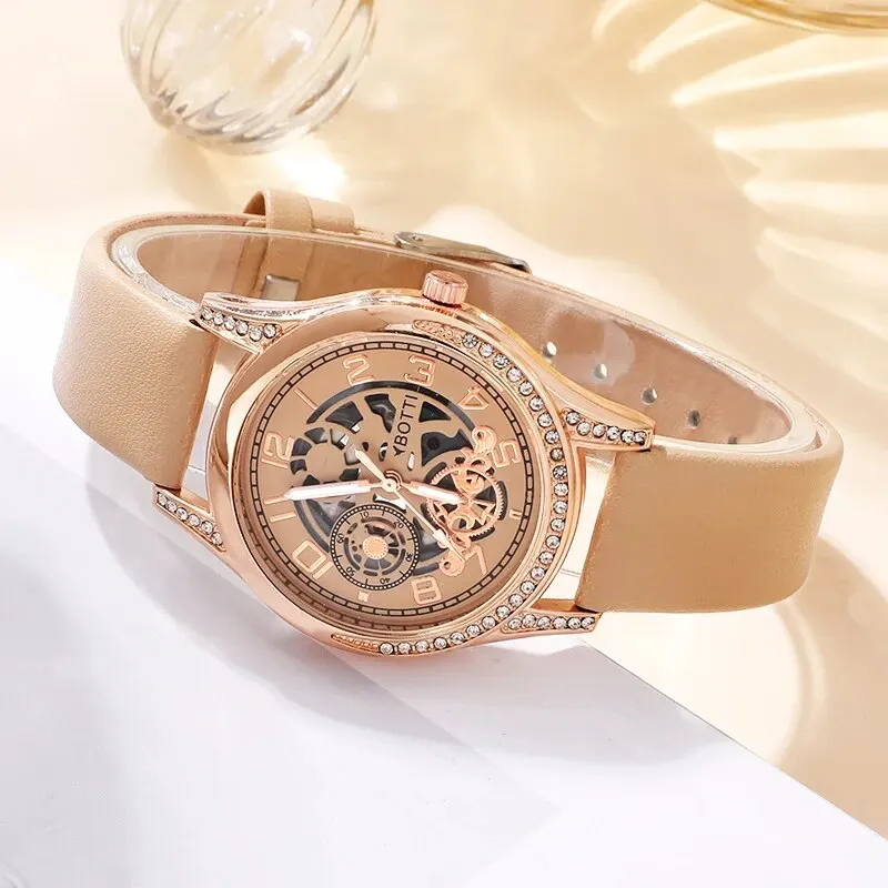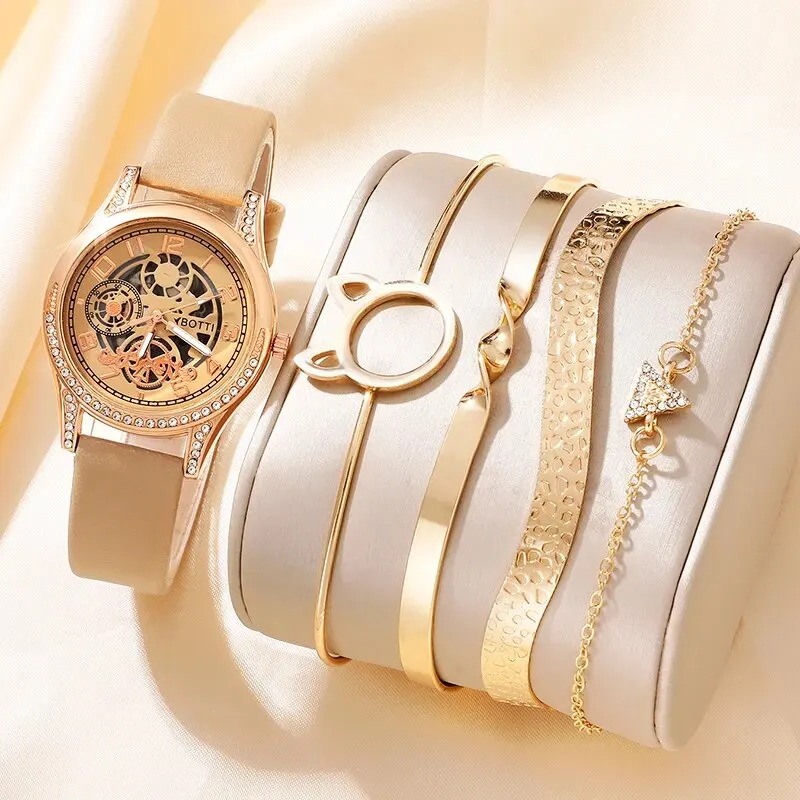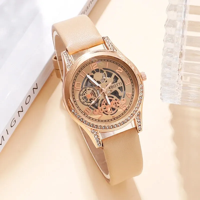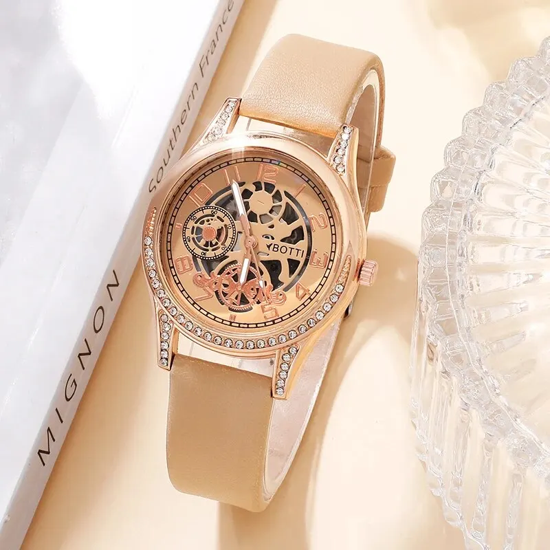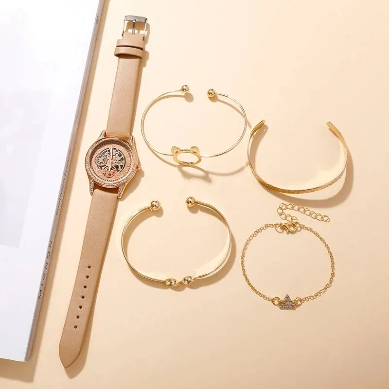 Women’s Fashion Watch Casual Khaki Leather Belt Watches Ladies Rhinestone Quartz Wristwatches Bracelet Set Clock Montre Femme
