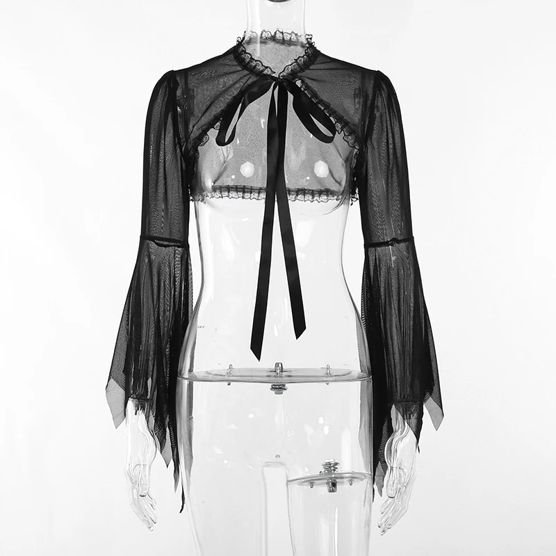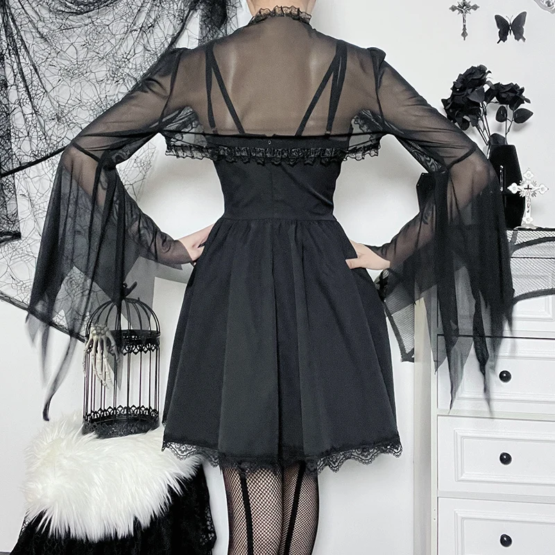 Women’s Gothic Style Dark Style Short Coat Lace Strap Irregular Bell Sleeve Long-Sleeved Blouse